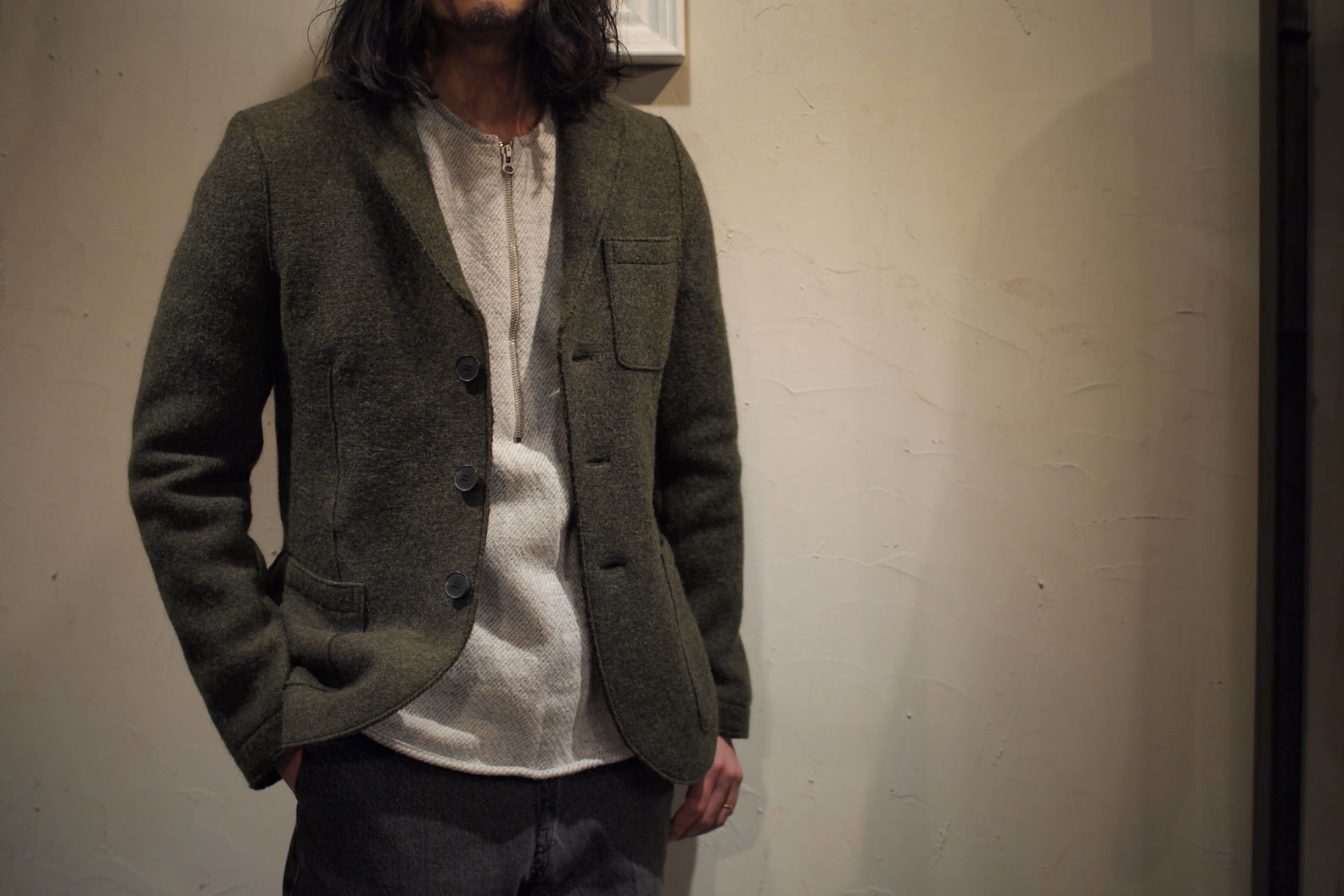 程よく肉厚で弾力のあるボイルドウールは、裏地を付けないブランドの意向と相俟って、ストレスフリーな着心地です。