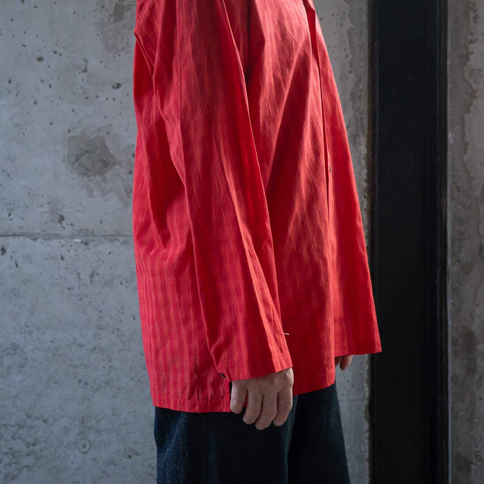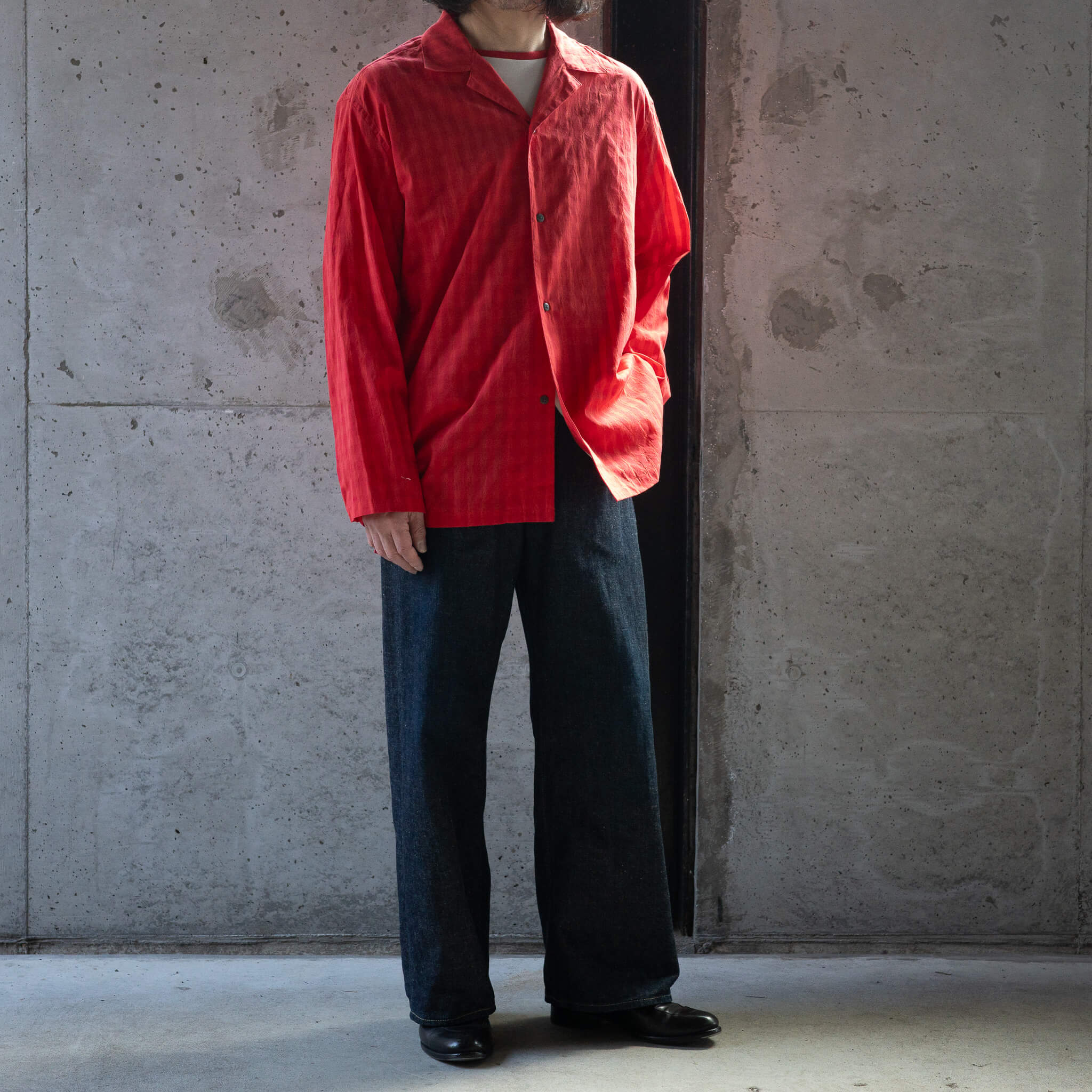 スリーピングシャツをベースとしながらも、襟型やボタンバランスを調整し、ジャケット寄りに仕上げたアイテムとなります。