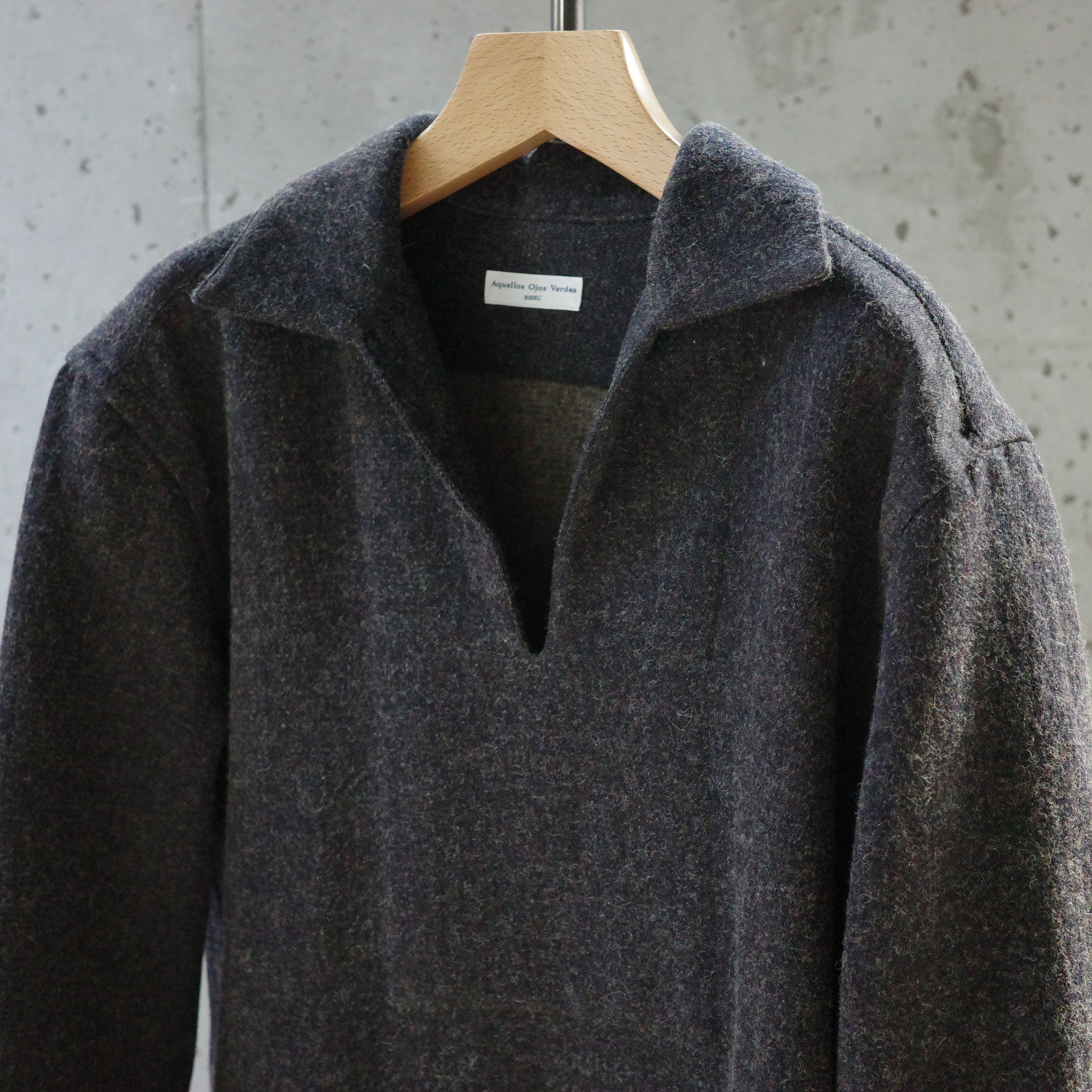 裏地に起毛をかけボアのように仕上げていますので、生地全体もモチっとしたタッチ。程よく肉厚で、襟付きのセーターのような印象を受けます。