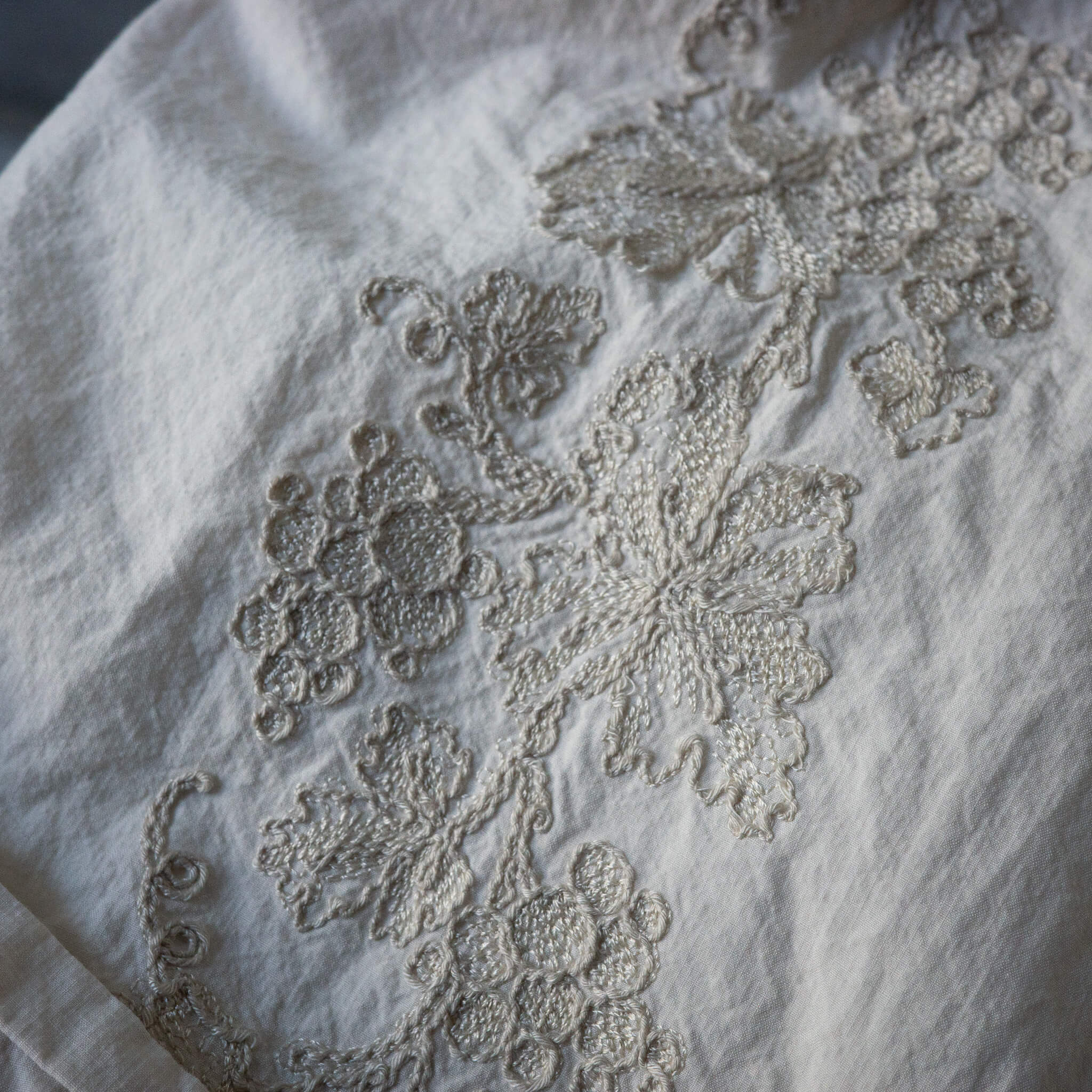 刺繍は、太さの異なる2種類の糸を使い分けて構成。