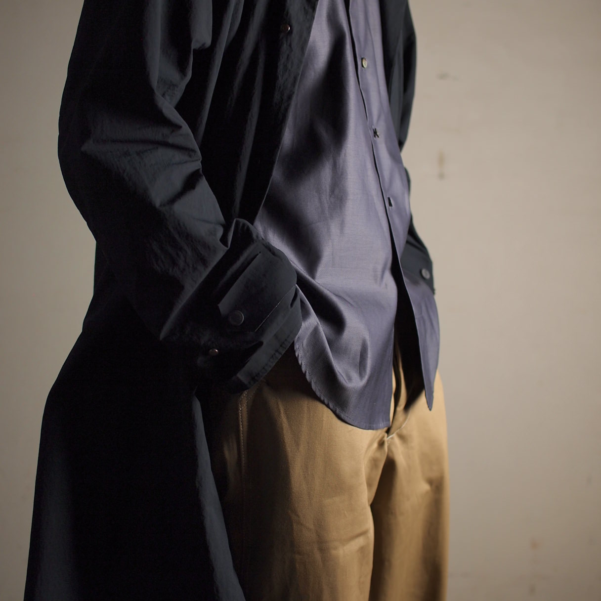 トラディショナルな印象を受けるストライプ柄ですが、天日ワッシャー仕上げによってナチュラルな風合いに。生地感的にも春くらいまでは着用可能です。