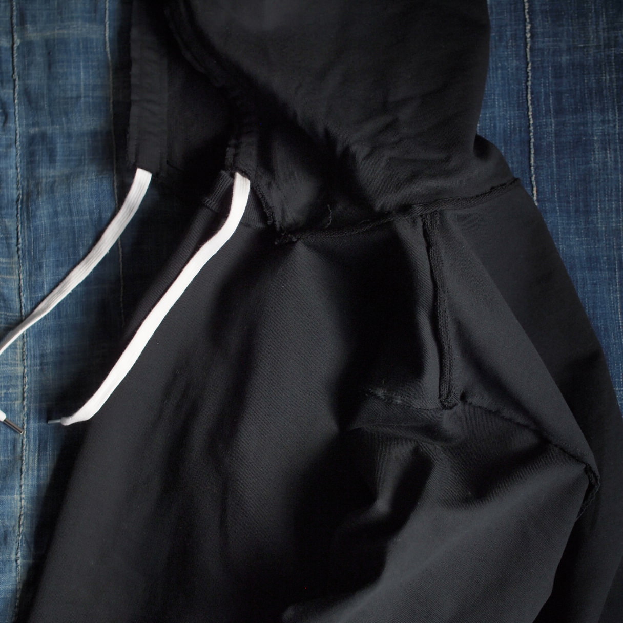 サイドダーツポケットパンツ/Whiteはポリエステル、インシームテープブーツカットパンツ/Navy&Beigeはリネン、スリーブパターンパンツは12ozのブラックデニムを使用しています。