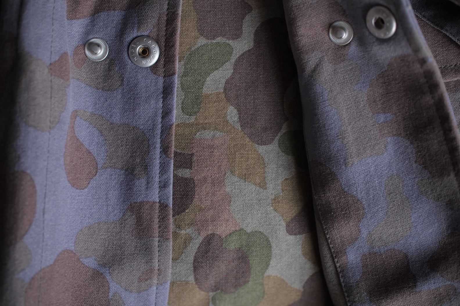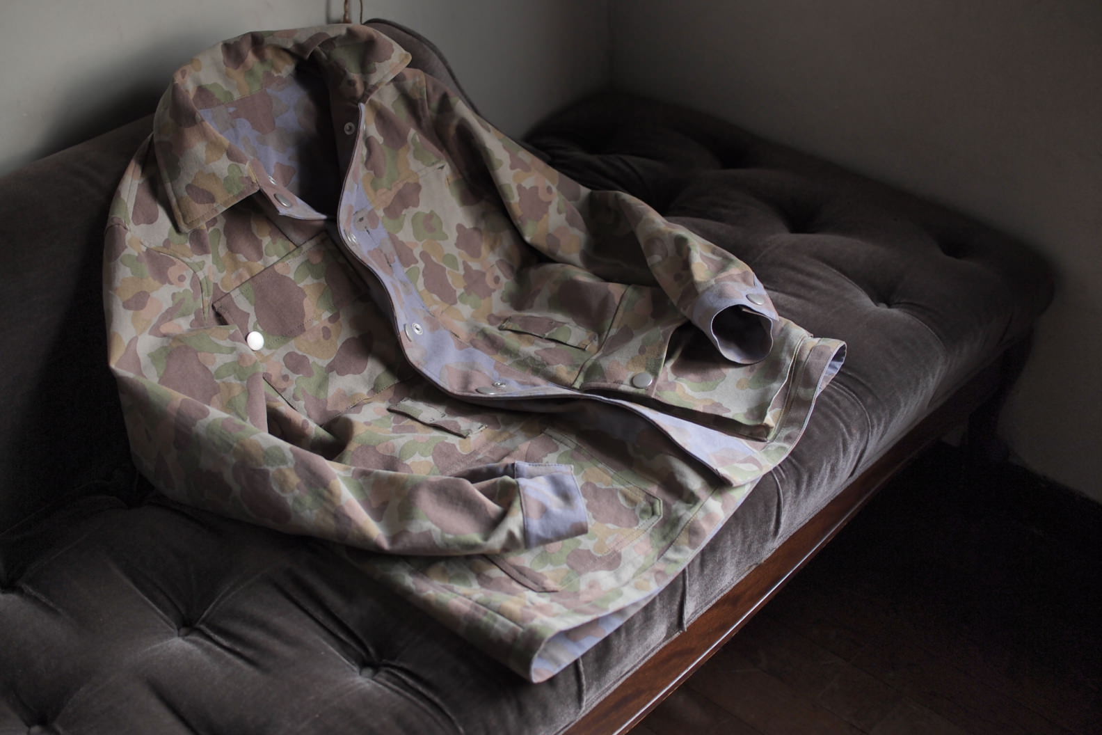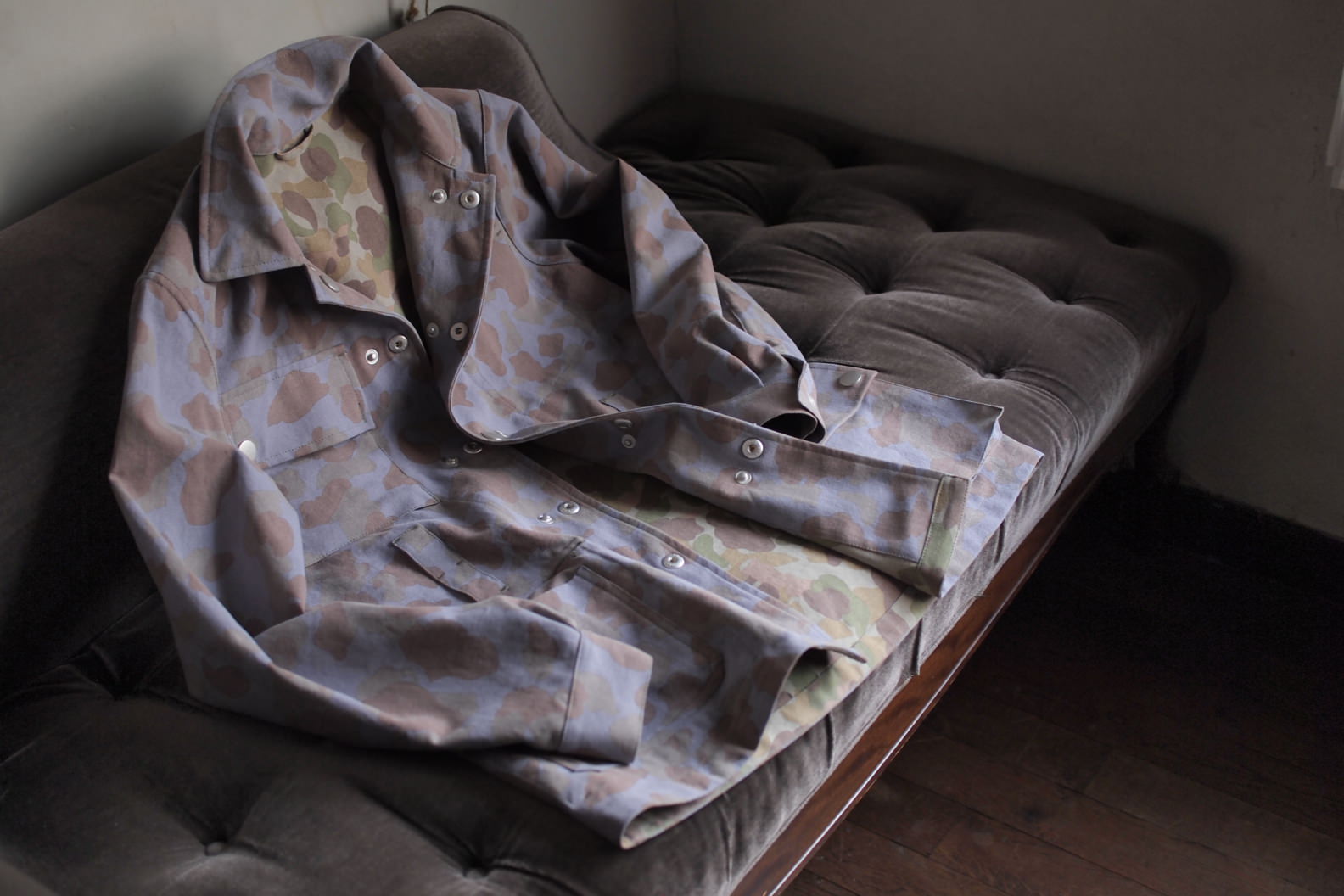ファブリックはイタリア・Lyria社と共同制作した、ダブルサイドのフロッグスキンカモフラージュ。