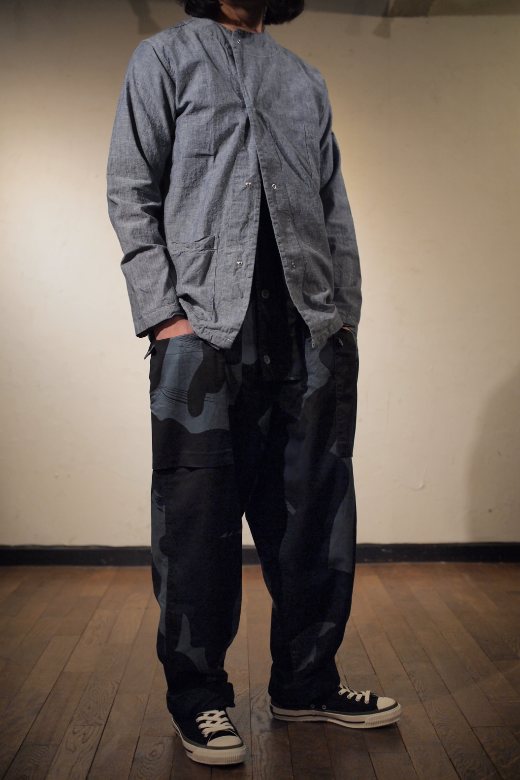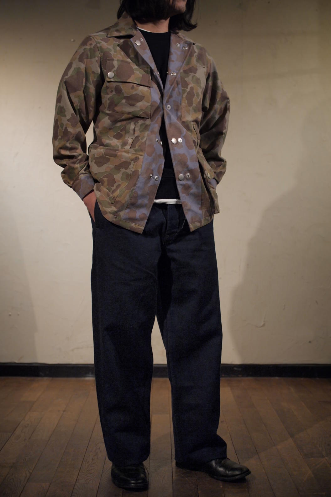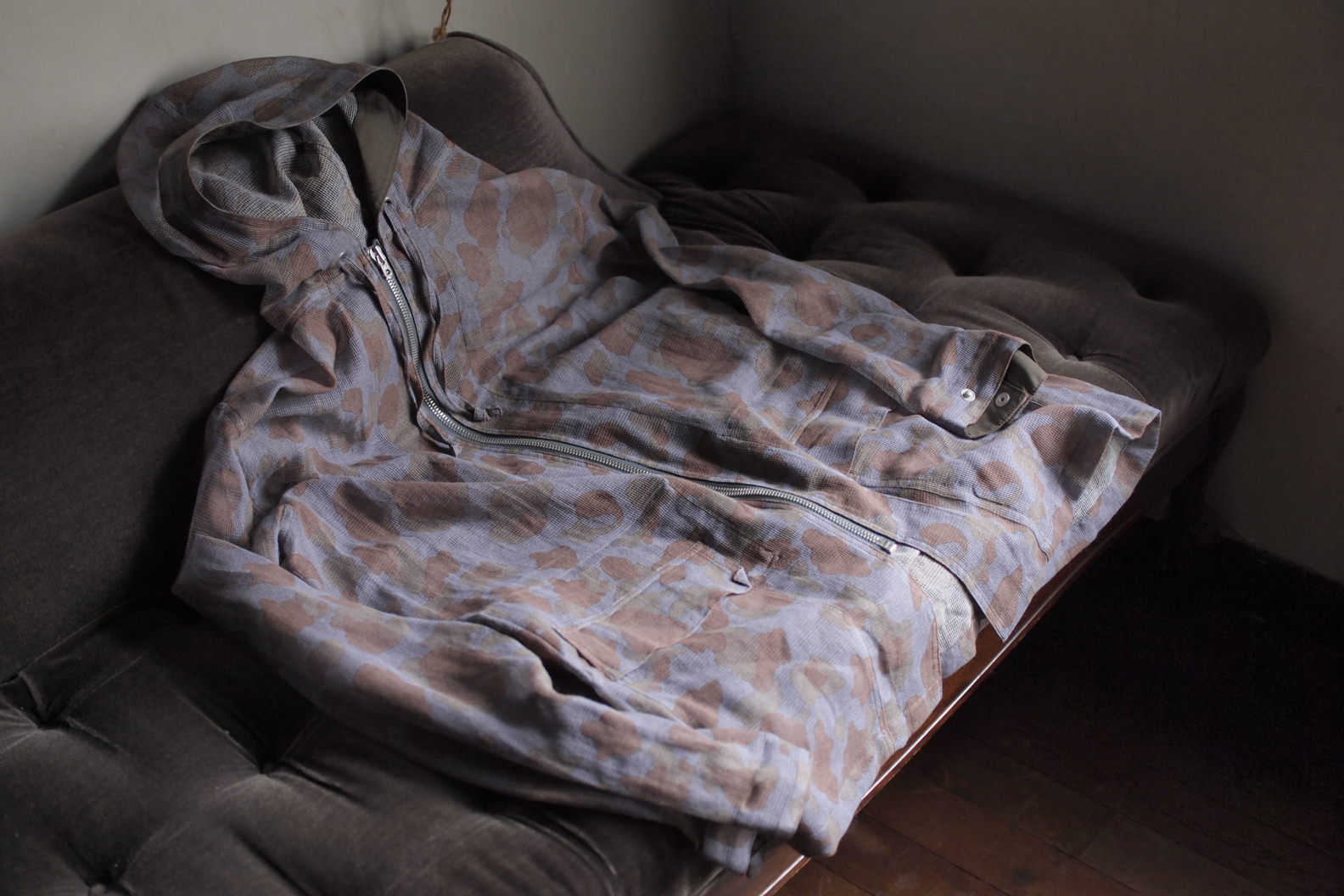 ファブリックはイタリア・Lyria社と共同制作した、ダブルサイドのフロッグスキンカモフラージュ。