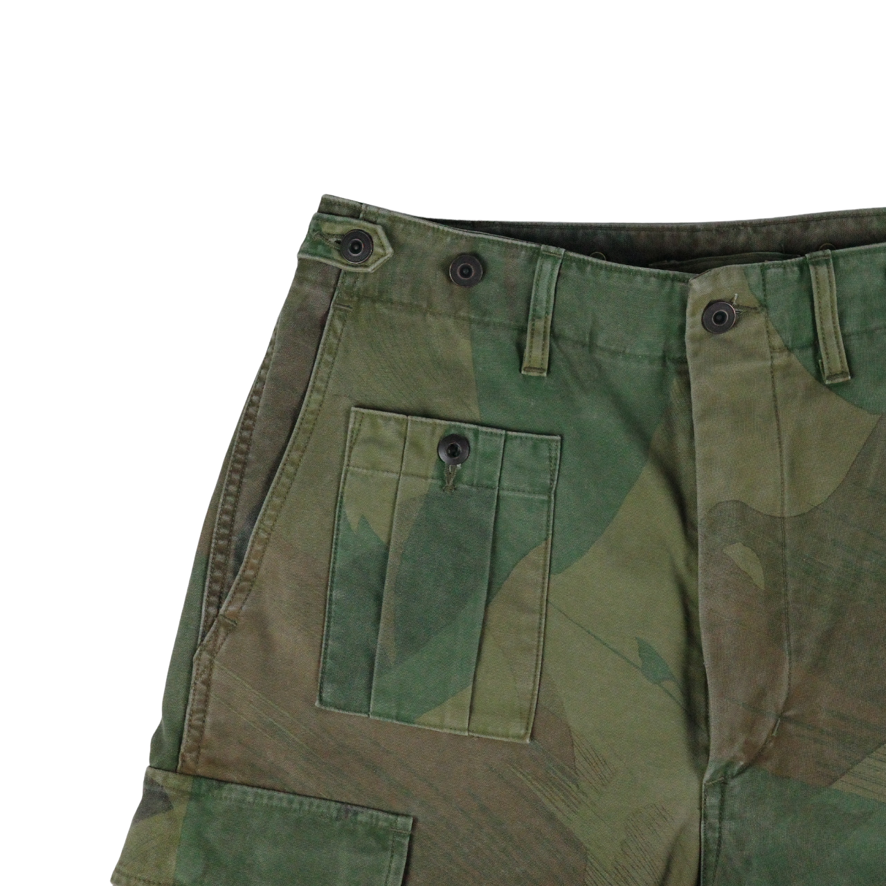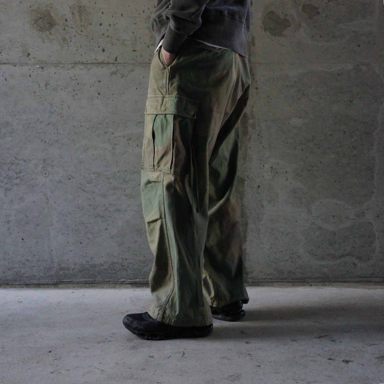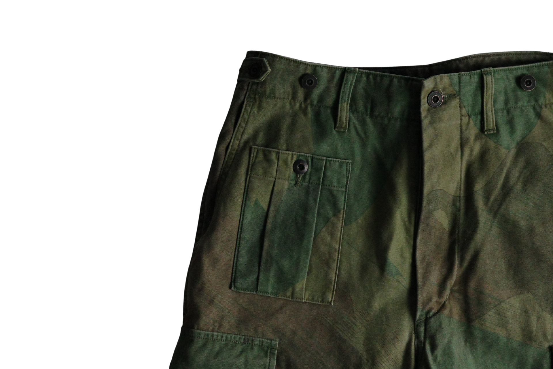 シルエットなどの仕様はアーミーカーゴパンツのまま、顔料プリントによってカモフラージュの乗せたNEWバージョン。