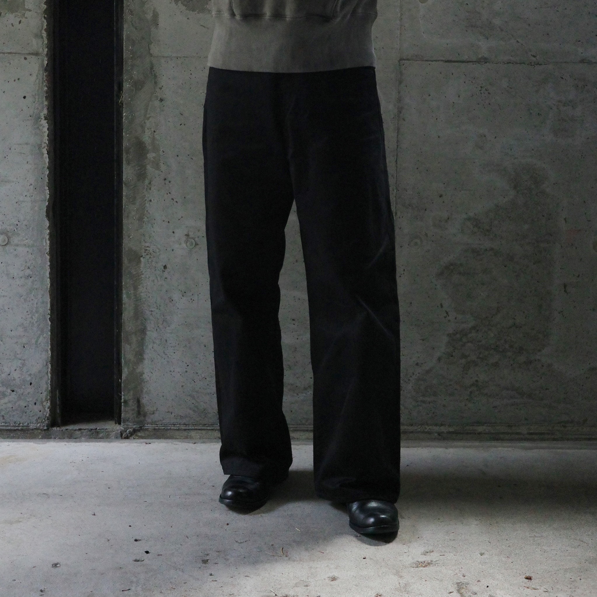非常に深い股上と、わたりから裾まで真っすぐに落ちる太めのバギーシルエット。ボリュームはありますが腰回りはすっきりとしていますので、野暮さもなく、キレイなラインを形成してくれます。