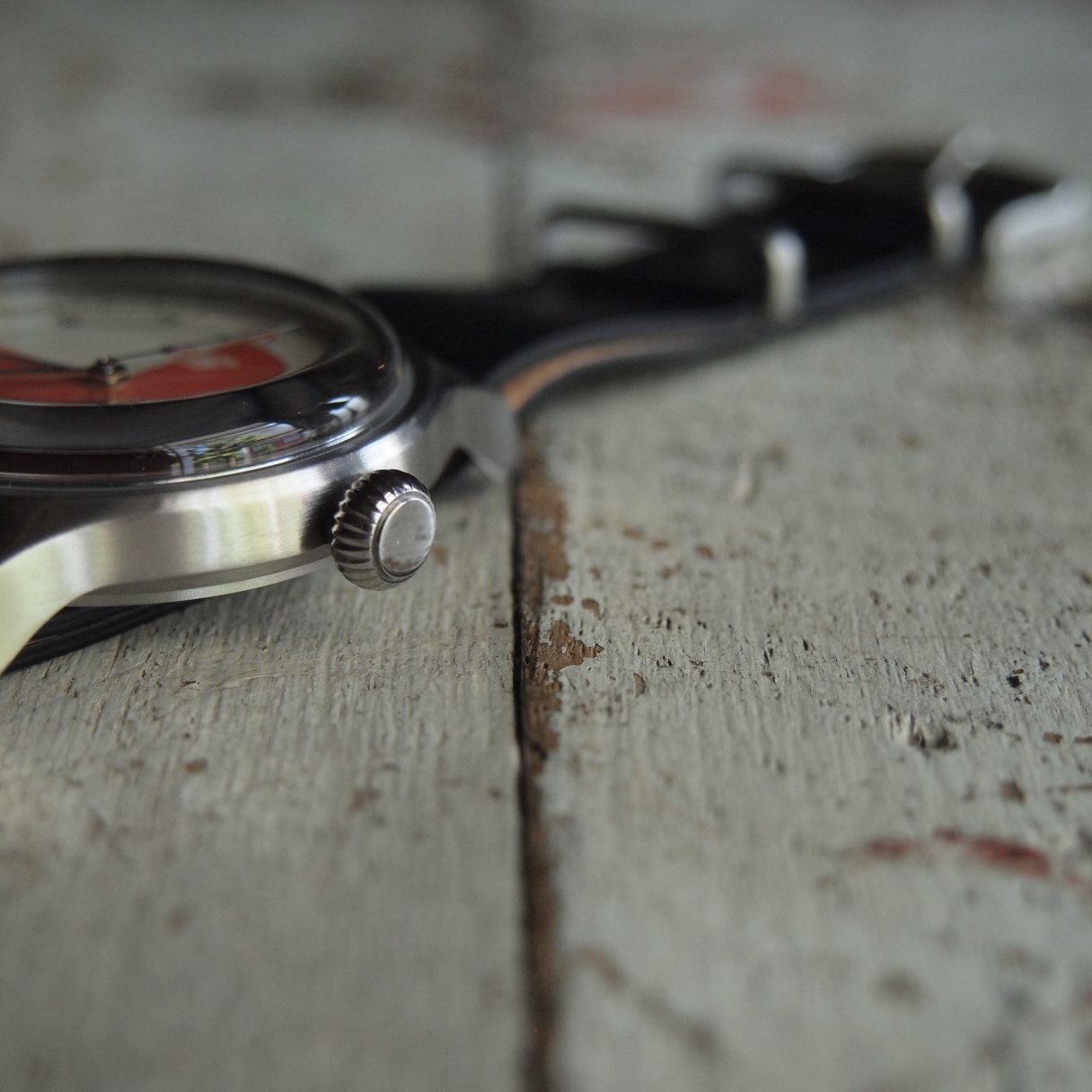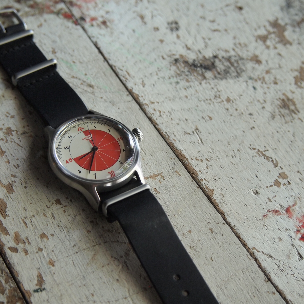 フットボールのゲーム時間(前後半45分)を示しす、文字盤の3/4を占めるレッドカラー。