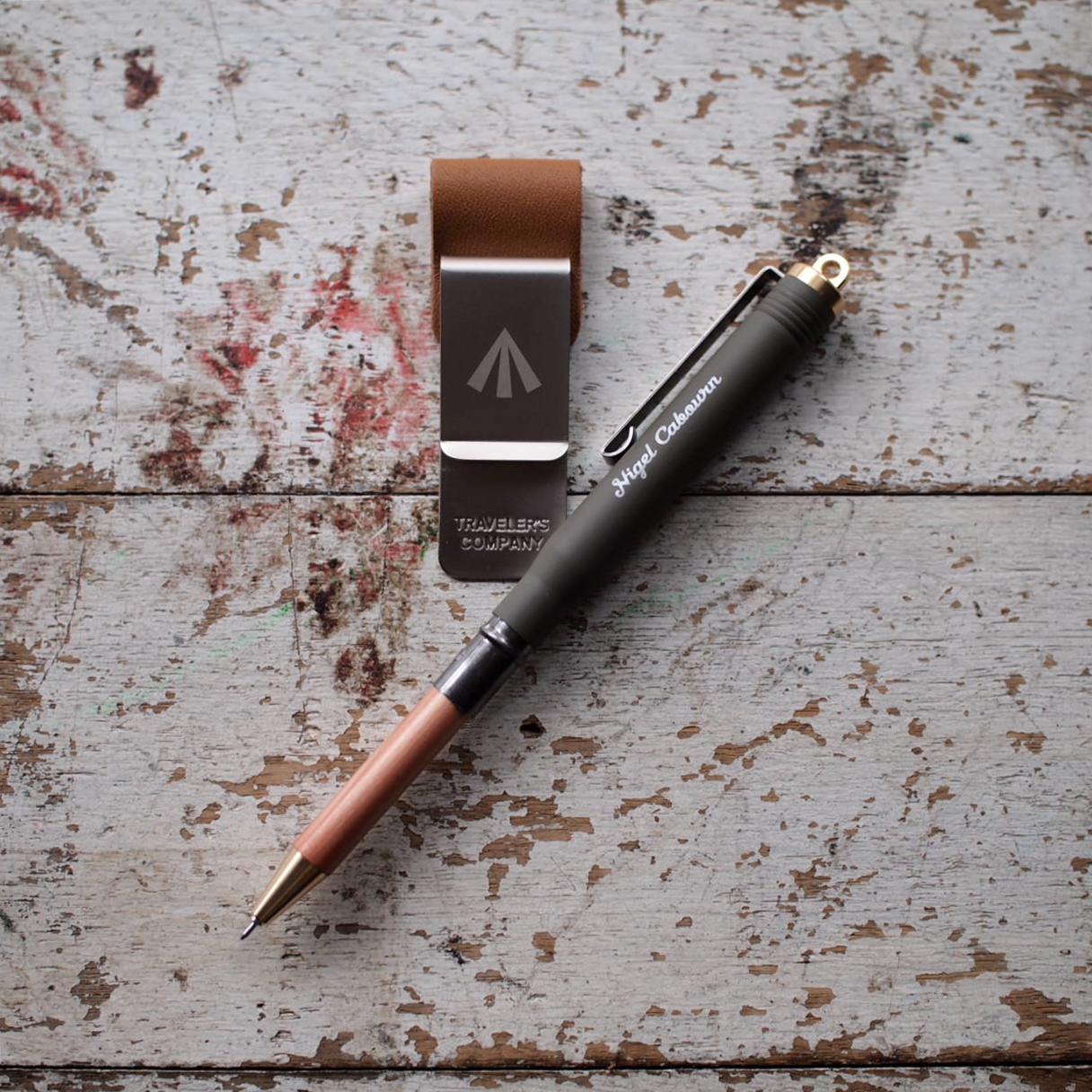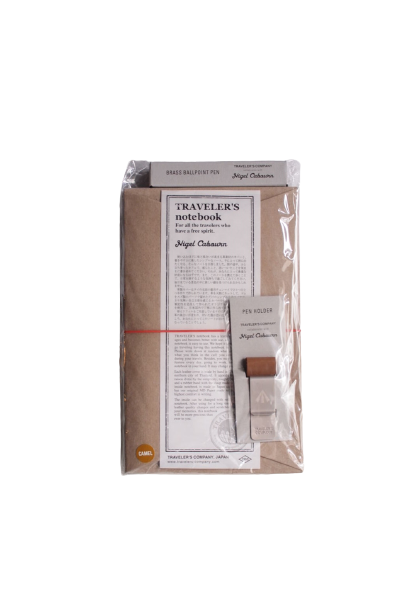 今回のコラボレーションモデルは、レザーカバー+迷彩柄がプリントされたノートリフィル(無地)をベースに、ペンホルダーとブラスボールペン、予備のゴムバンドが2種類(本体にはレッド、スペアゴムはアーミーグリーンが付属)、更にはノートリフィルとステッカーがセットになった豪華バージョン。