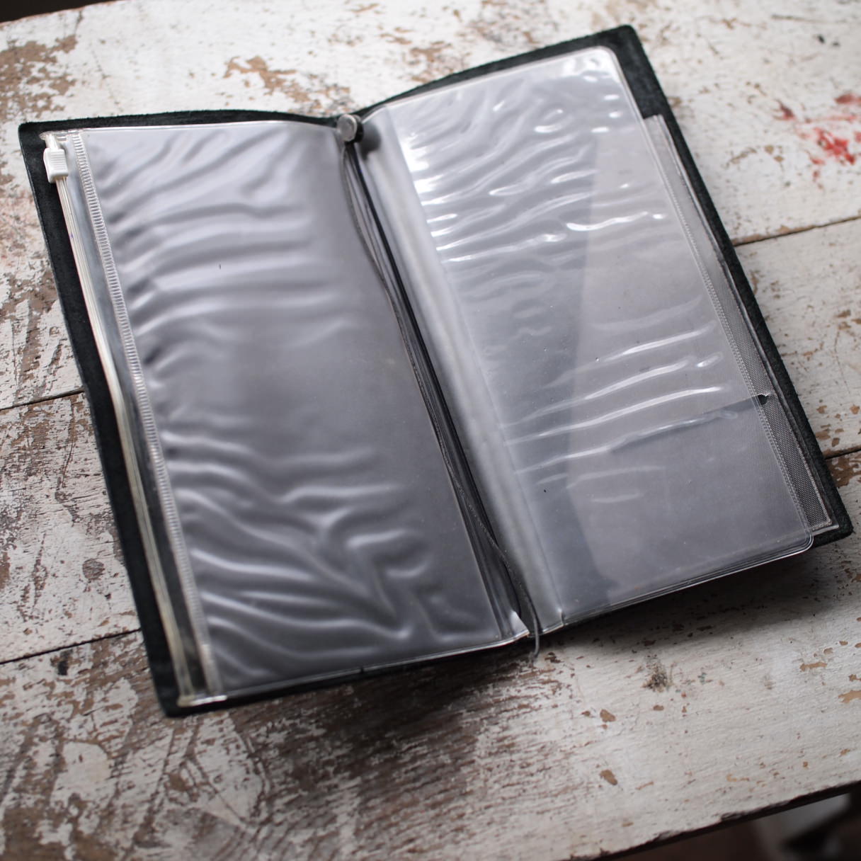 こちらは私物のトラベラーズノート。それほどカスタムはしていませんが、スケジュール帳の他に、別売りのジッパーケースとポケットシールを付けて愛用しています。
