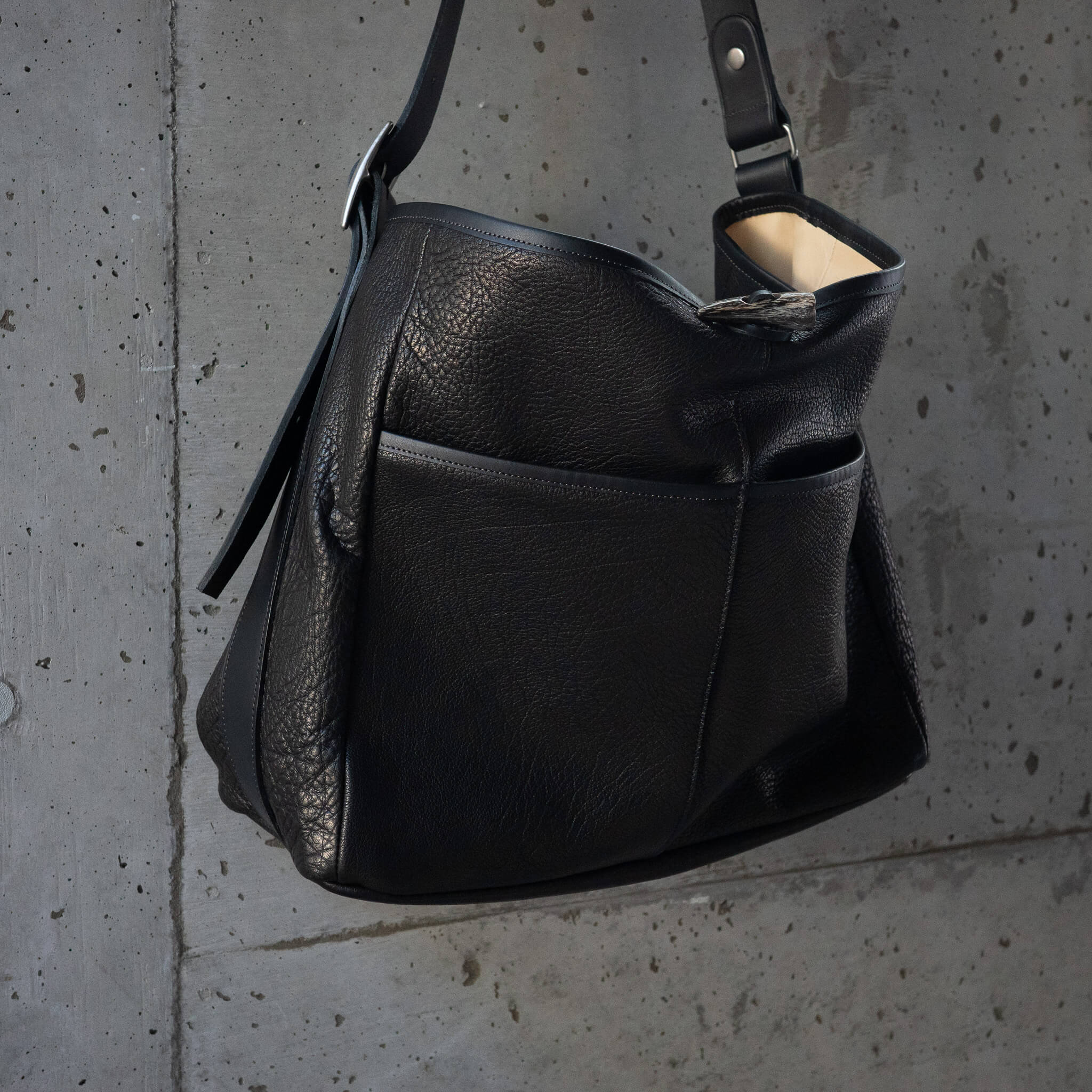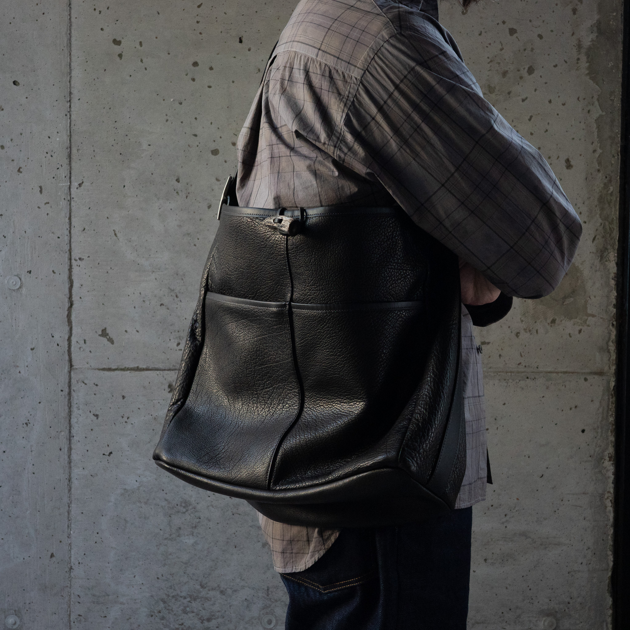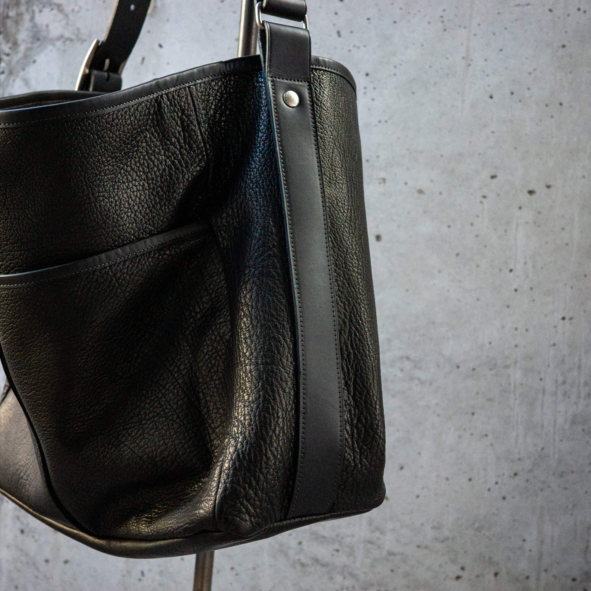 荒々しい表情を持つ、シボの強いバッファローレザーを使用した、ポストプロダクションの 2 Pocket Tote Bag