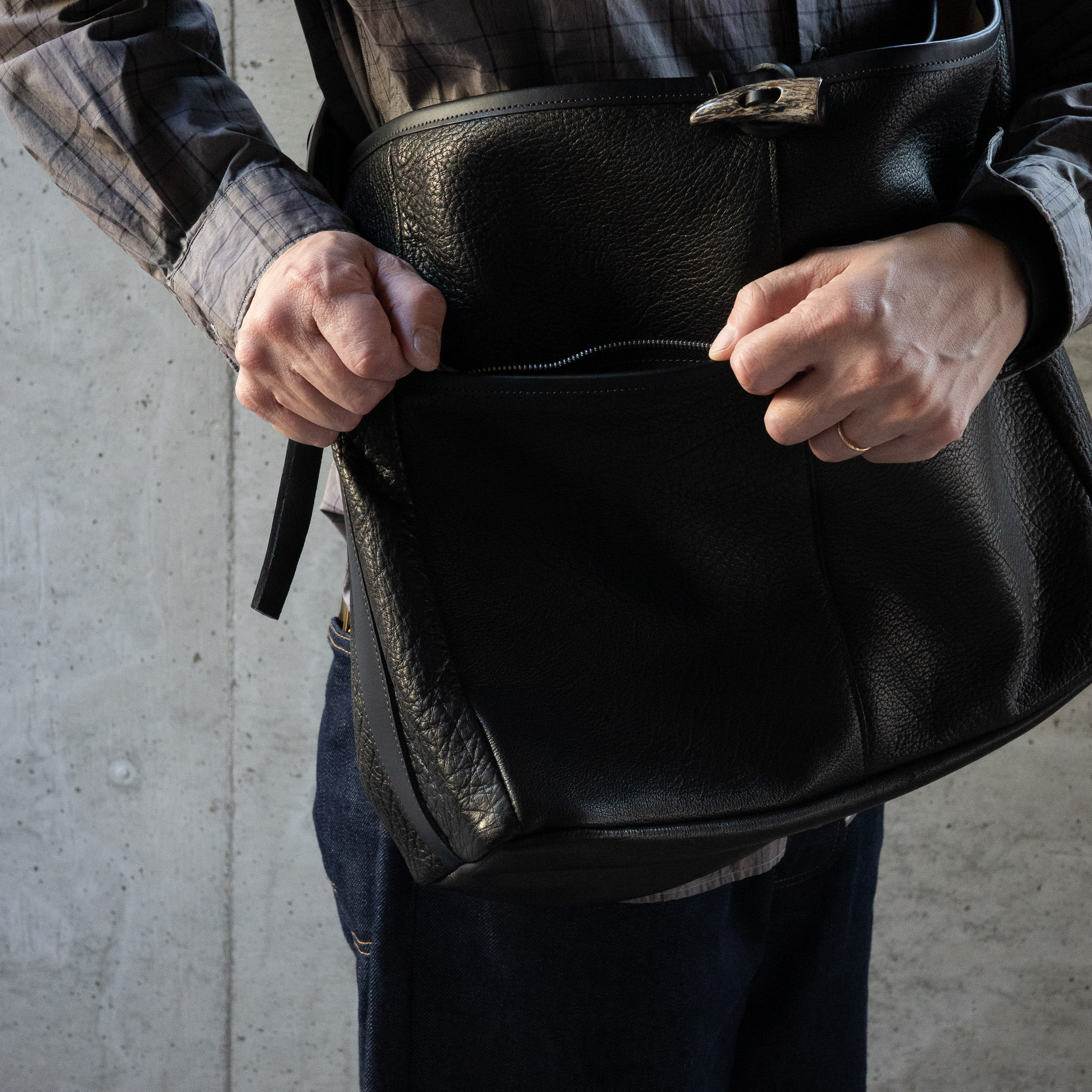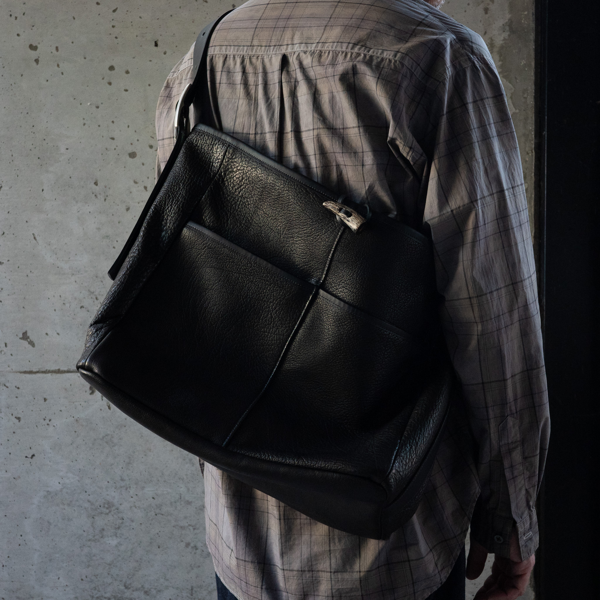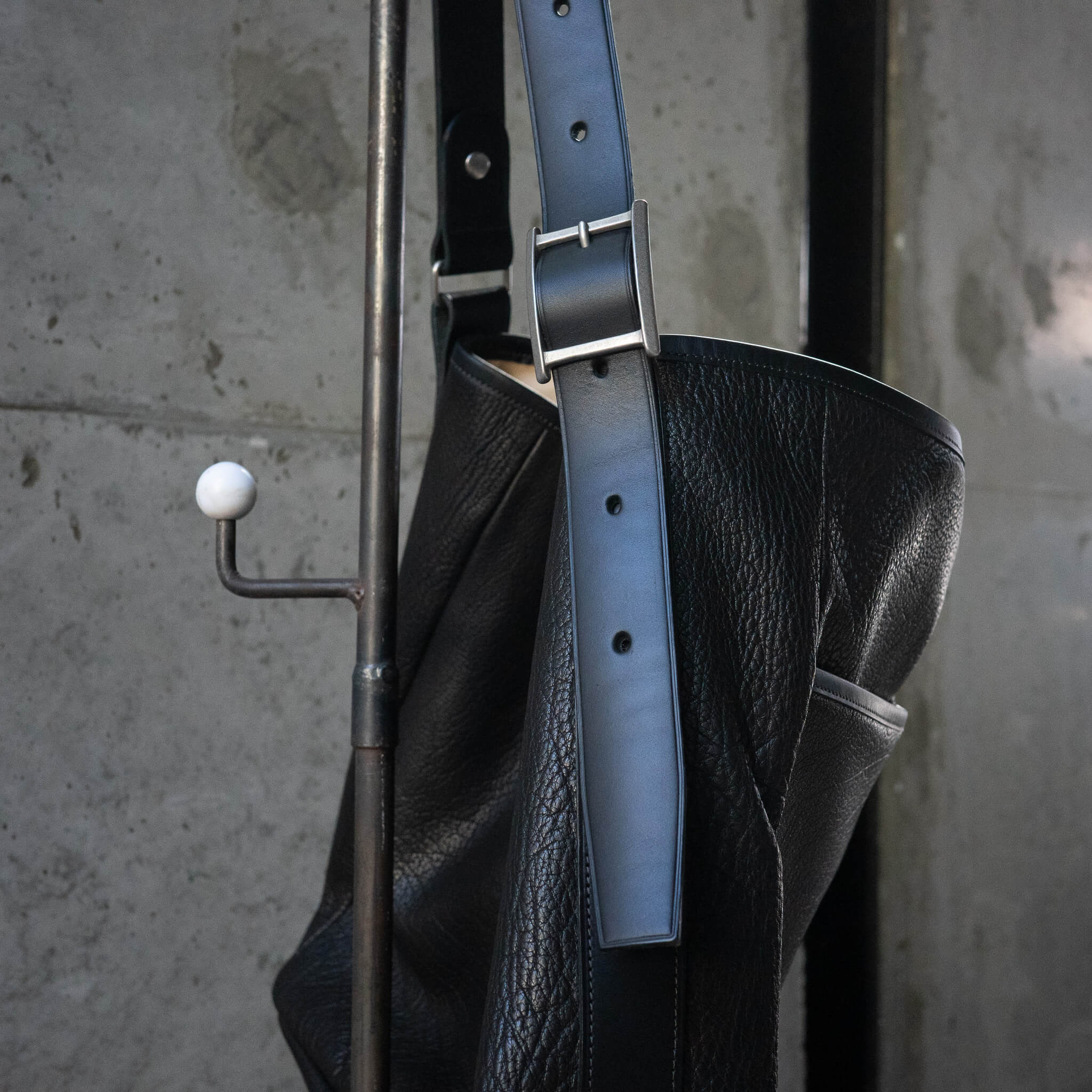 美しく整えられたショルダーベルトと、シボの強いバッファローレザー。この対比が、デザイン自体に奥行きを与えています。