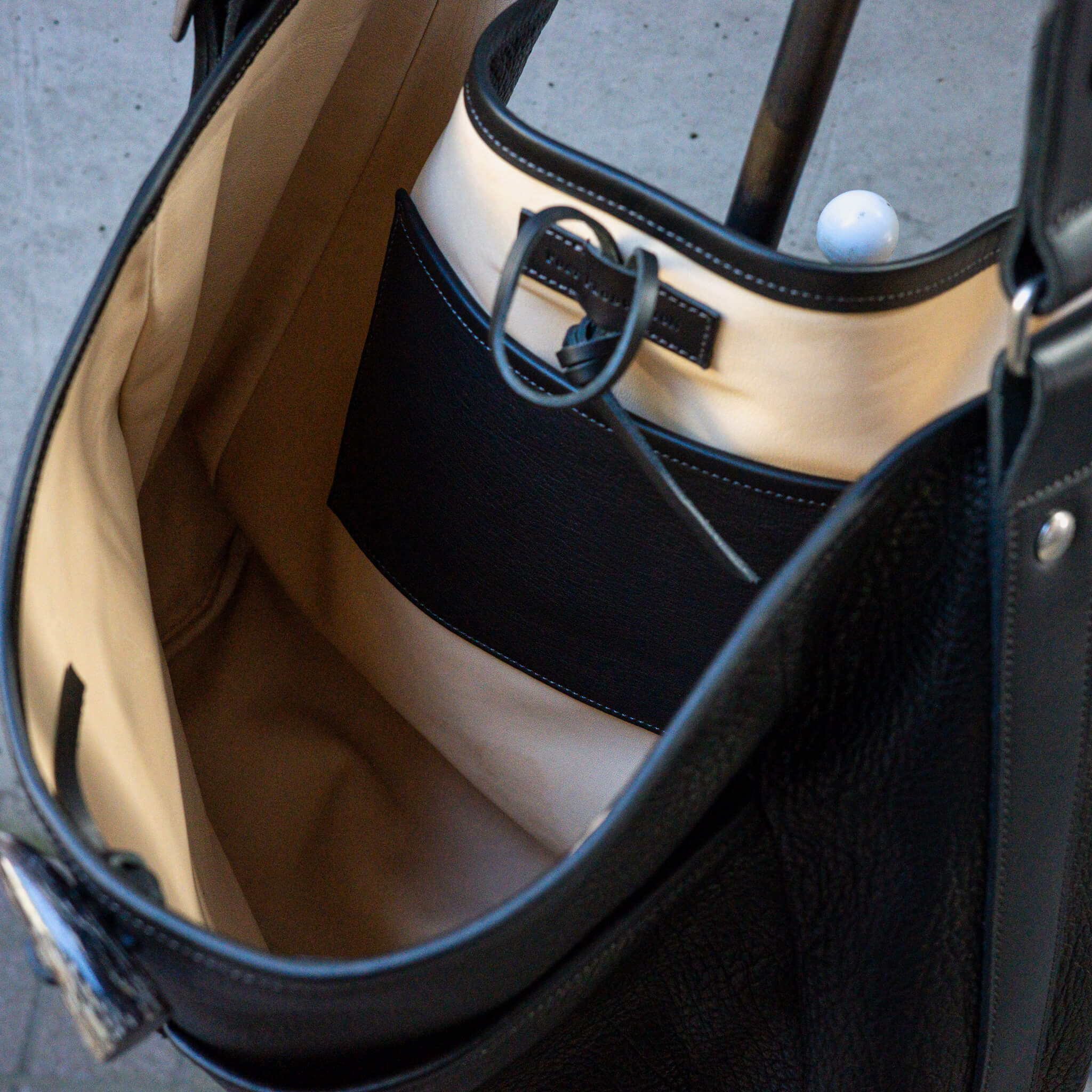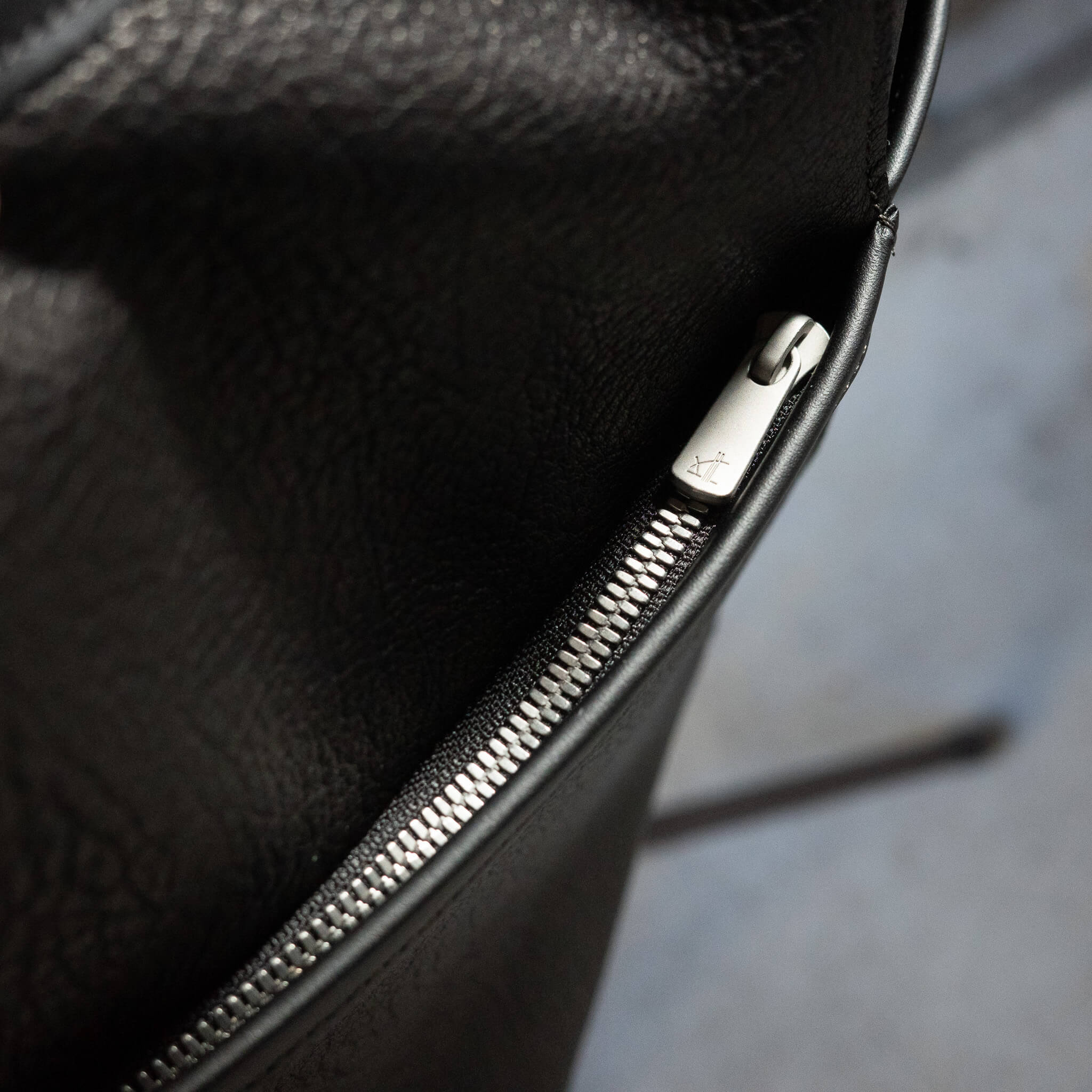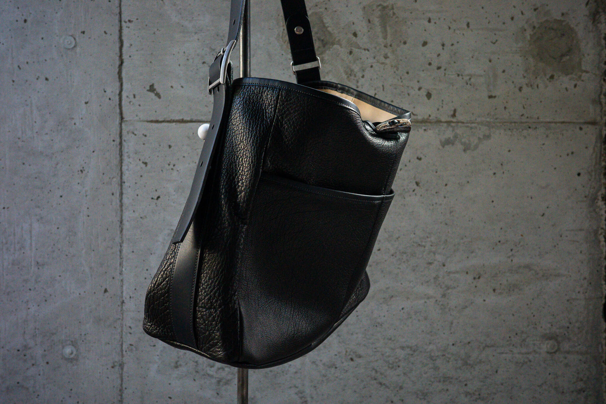 美しく整えられたショルダーベルトと、シボの強いバッファローレザー。この対比が、デザイン自体に奥行きを与えています。