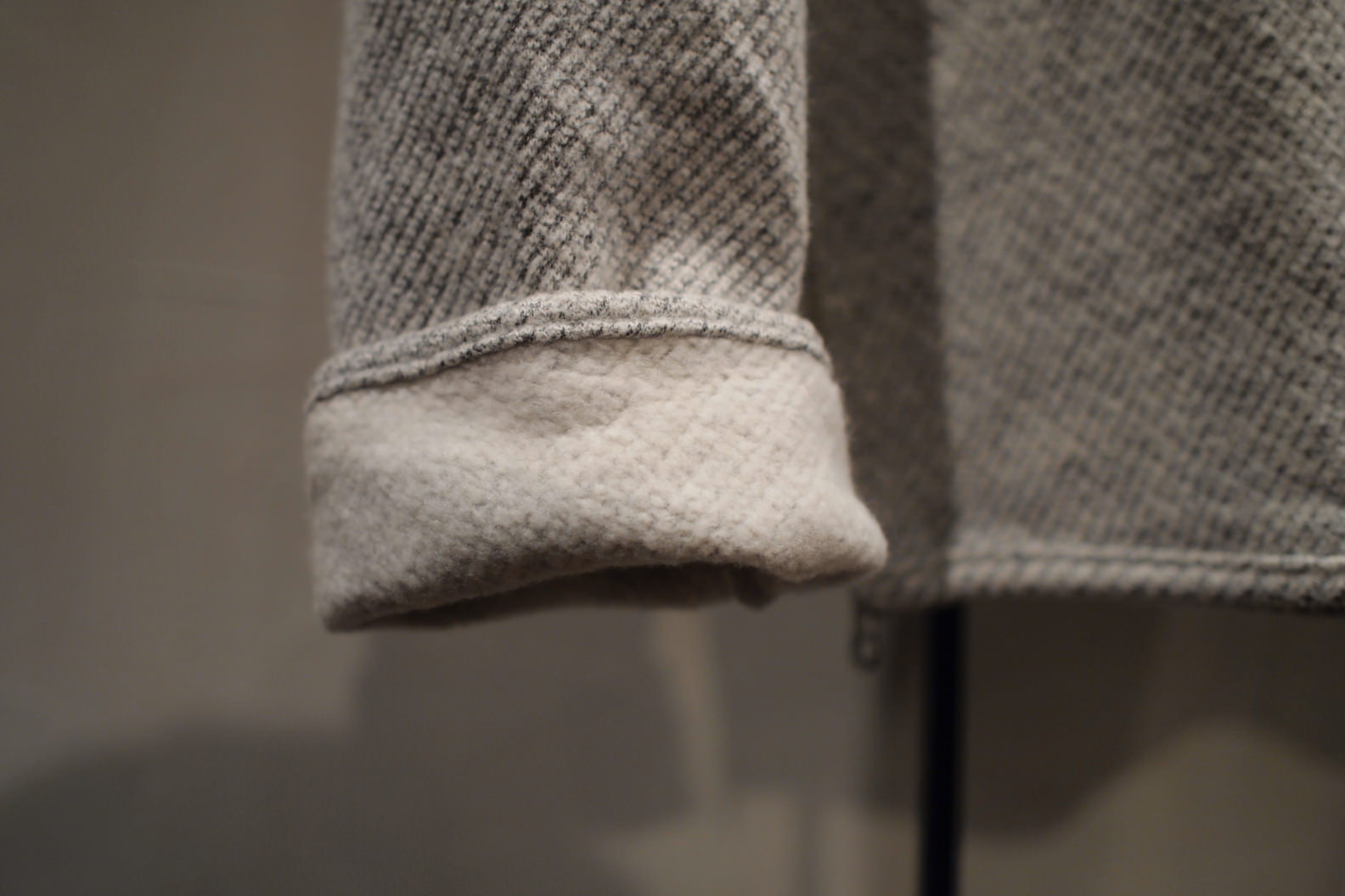 杢色が目を引く柔らかなスウェット素材は、和歌山県の吊り編み機でゆっくりと編み立てられたもの。