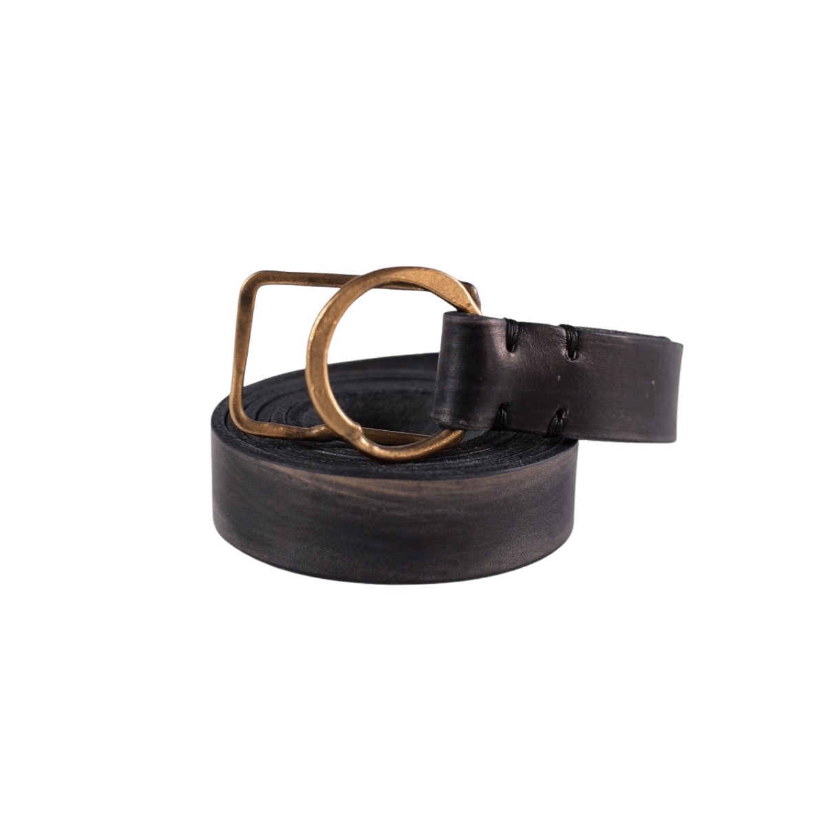 職人の手によって形成された形の異なる2つのバックルに、ムラ感のあるカーフレザーを組み合わせたリングベルト。